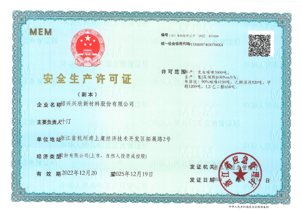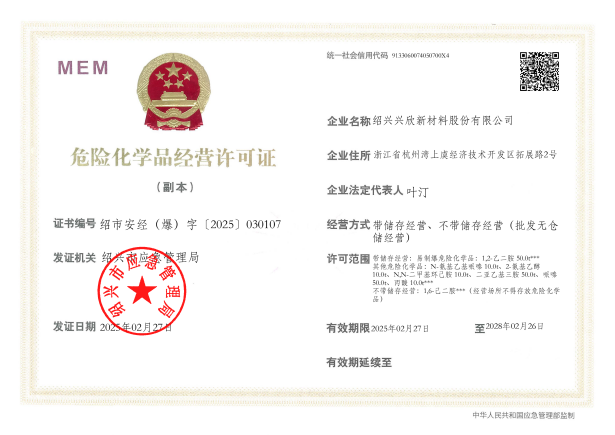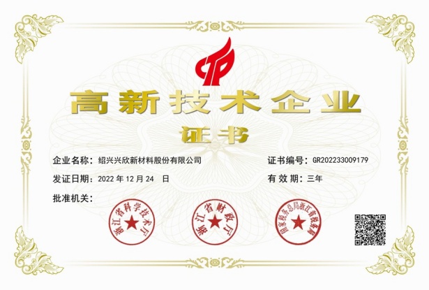 紹興興欣新材料股份有限公司成立于2002年06月27日,占地面積122畝,位于杭州灣上虞經濟技術開發(fā)區(qū)拓展路2號,現有職工200余人,專業(yè)技術人員50余人;博士、碩士研究生30余人組成的一支知識型、專業(yè)化的技術科研團隊。公司面向全球市場,專業(yè)開發(fā)電子化學品、環(huán)?;瘜W品、醫(yī)藥中間體、高分子材料等先進新材料重點領域的省級科技型企業(yè);建有浙江上虞、安徽東至兩個生產基地。目前為“國家高新技術企業(yè)”、浙江省“隱形冠軍”企業(yè)、浙江省專精特新中小企業(yè);建有“省級”研究開發(fā)中心,共建天津大學浙江紹興研究院電子化學品研發(fā)中心。